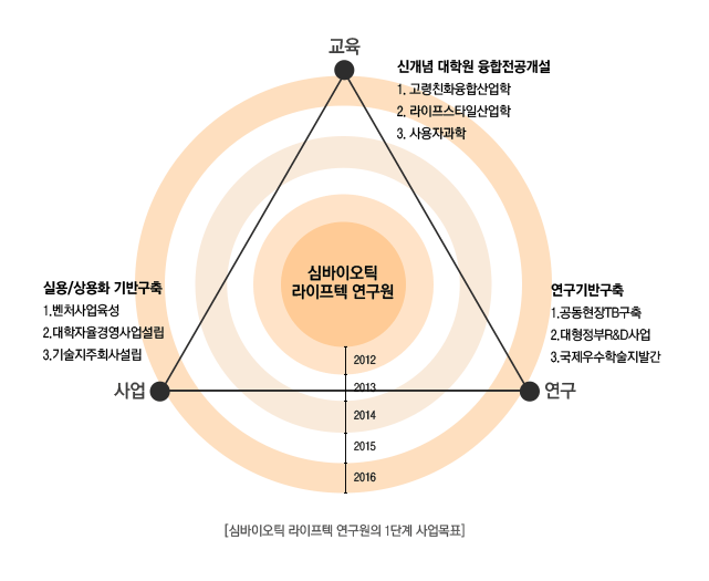 - 제 1단계 5년간은 이러한 장기적 비전을 성취할 수 있는 기반을 구축하는 기간이 될 것으로, 그 목표를 연구 및 학술 진흥 부문, 교육개발 부문 및 산학협력사업 부분으로 구분하여, 상세한 내용을 정리하면 아래의 그림과 같으며, 구체적으로 설명하면 다음과 같다.